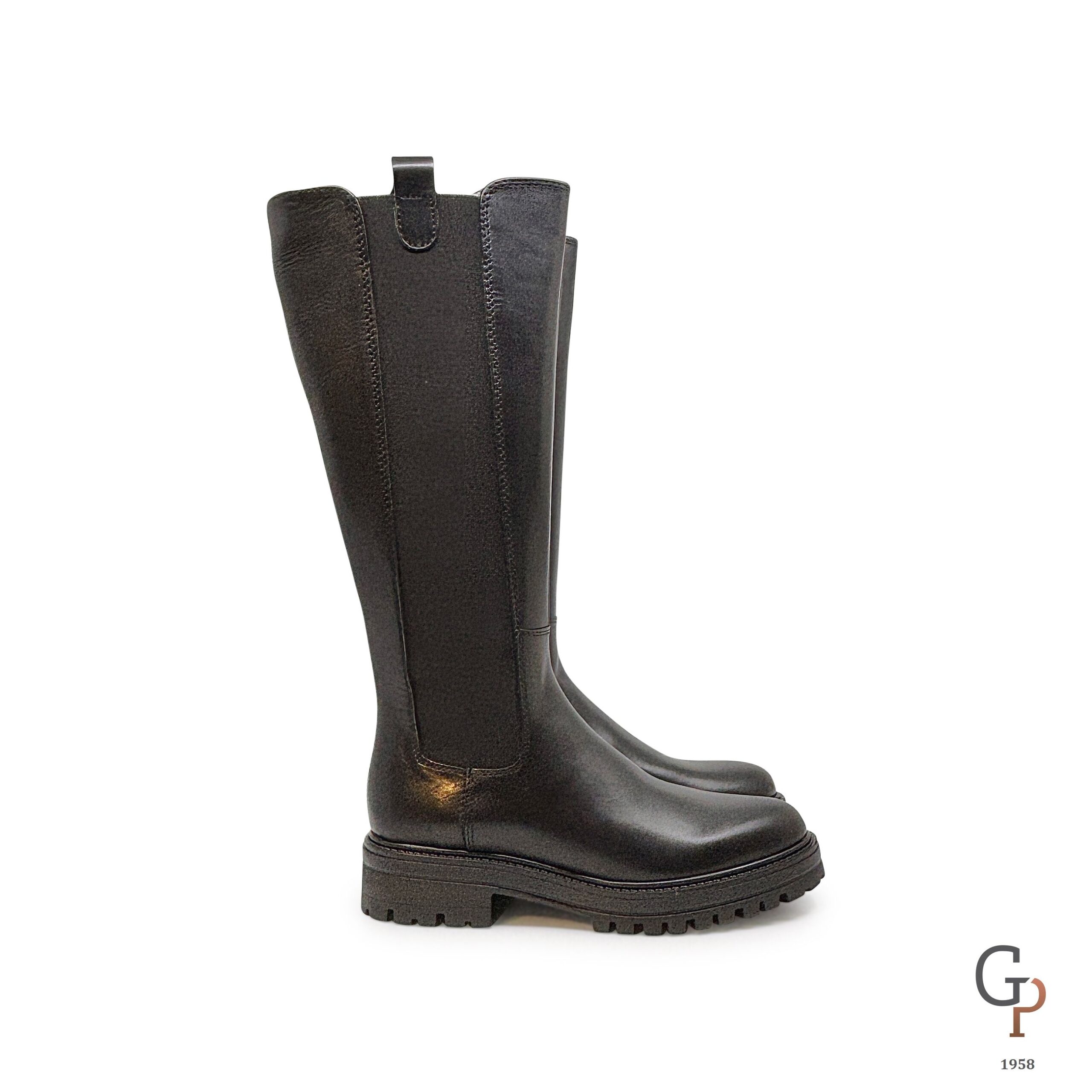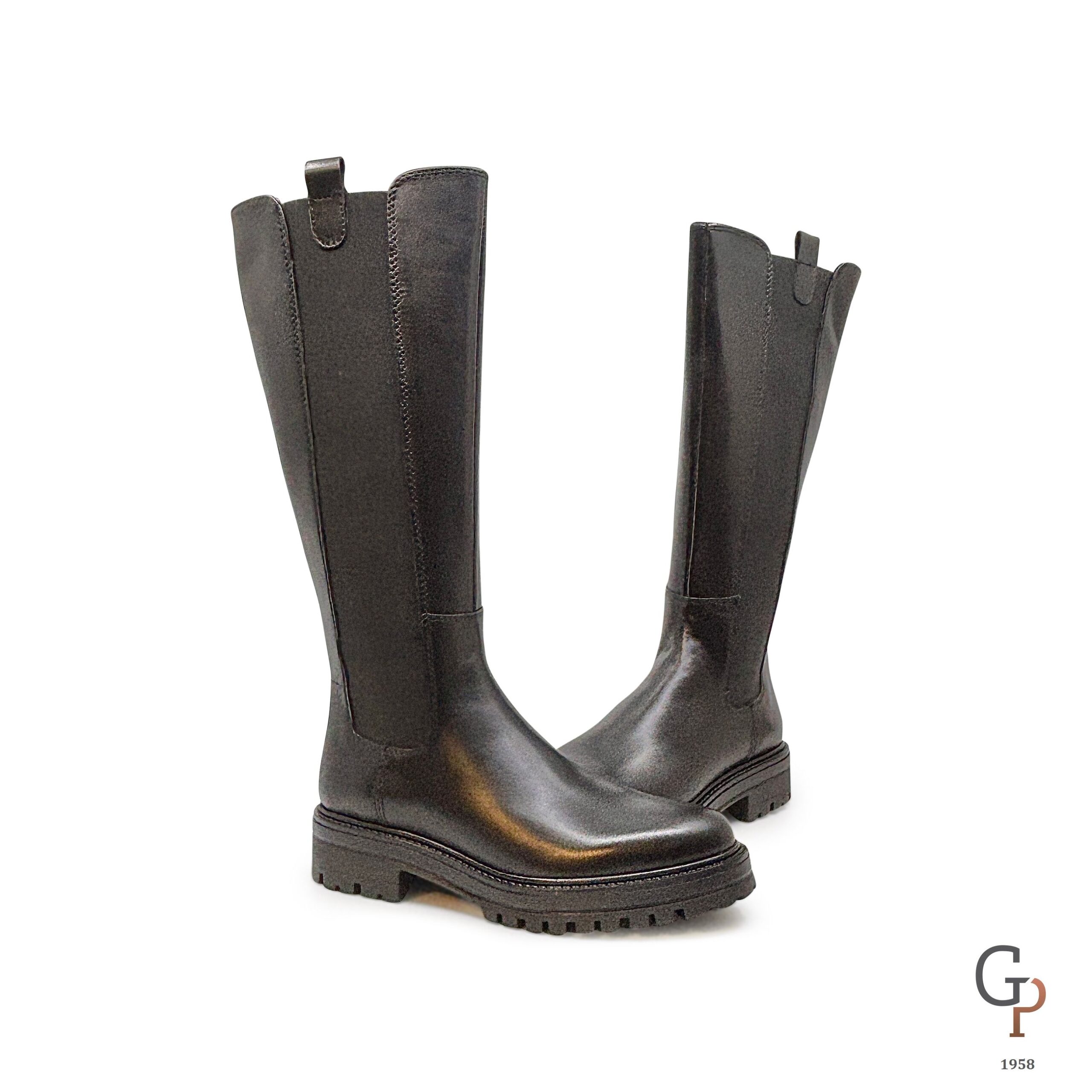 Stivale in pelle con elastici laterali per una calzata che si adatta anche per i polpacci più importanti. Suola in gomma con carrarmato, imbottitura calda e confortevole